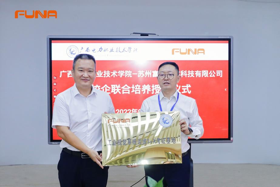 吳加富董事長向?qū)W校授“工業(yè)視覺系統(tǒng)運(yùn)維1+X考證基地”“工業(yè)視覺系統(tǒng)運(yùn)維人才校企聯(lián)合培養(yǎng)基地”校企合作牌匾。推動(dòng)學(xué)校與企業(yè)資源共享、深度融合,優(yōu)化企業(yè)人力資源,進(jìn)一步實(shí)現(xiàn)企業(yè)、學(xué)校、學(xué)生“三贏”的目標(biāo)。